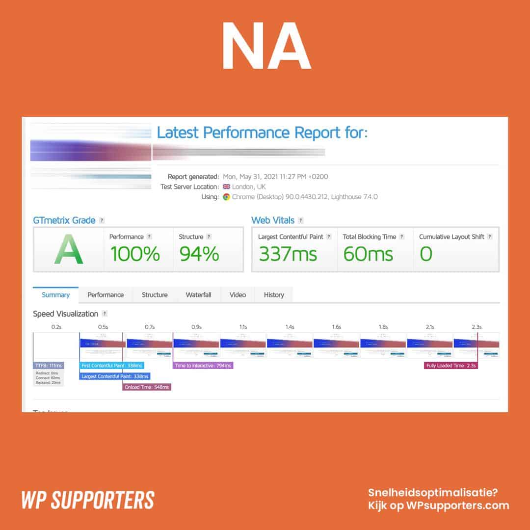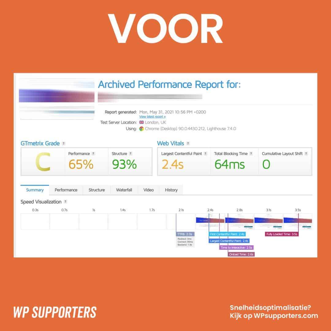 Iedere website waar wij WordPress onderhoud voor doen controleren wij op website snelheid. Proactief gaan wij aan de slag met de snelheid en vaak halen wij verbluffende resultaten zoals je hiernaast kunt zien.